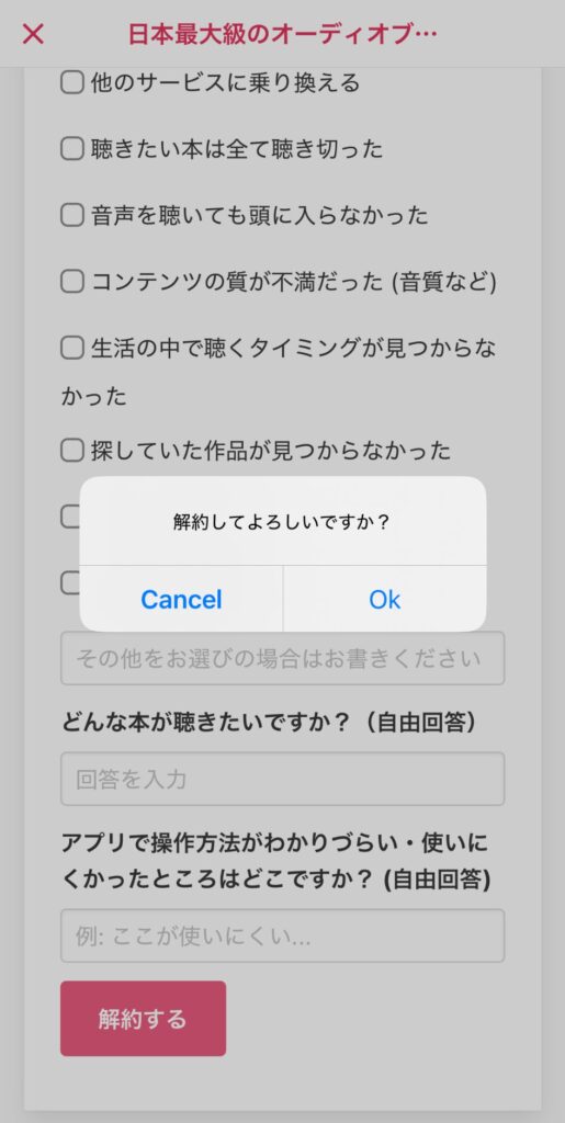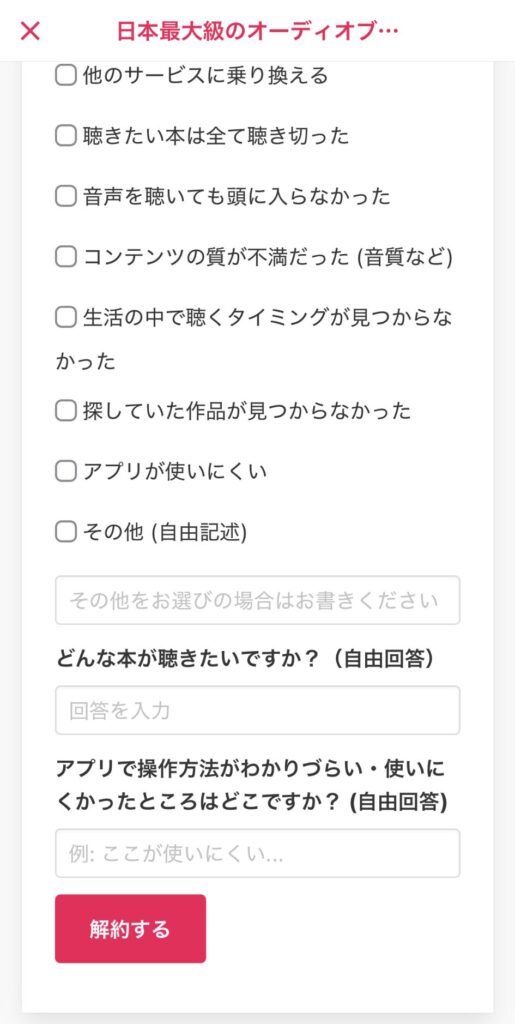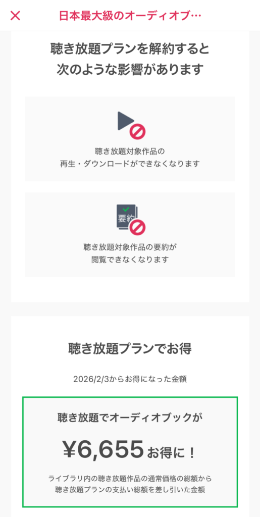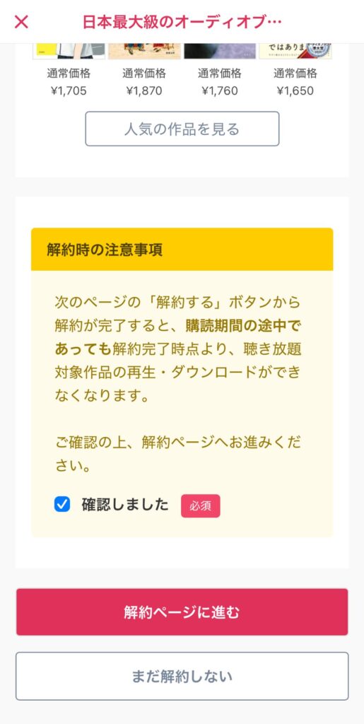 ただし解約が完了した瞬間から聴き放題作品が聴けなくなるので、今やめてOKか確認してから進めるのが安全です。