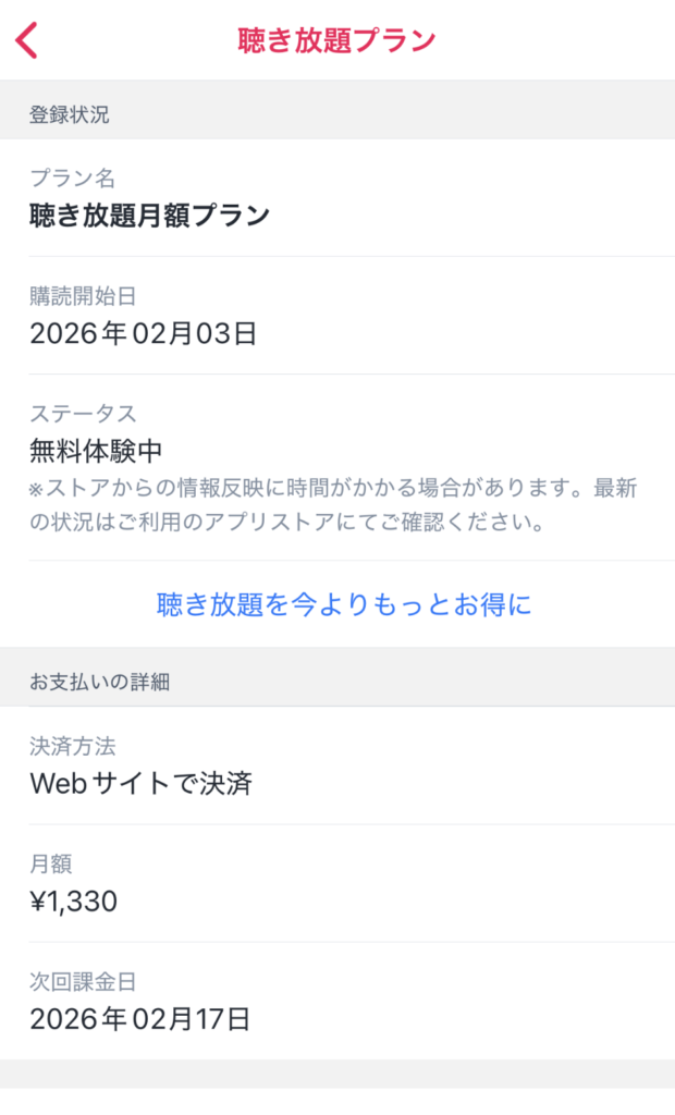 「聴き放題プラン」画面に、次回課金日と決済方法が表示されます。