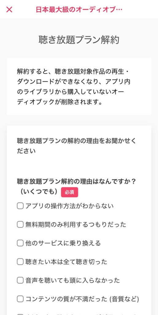 - 解約手続き完了後、アプリ内ライブラリから購入していないオーディオブックが削除されます