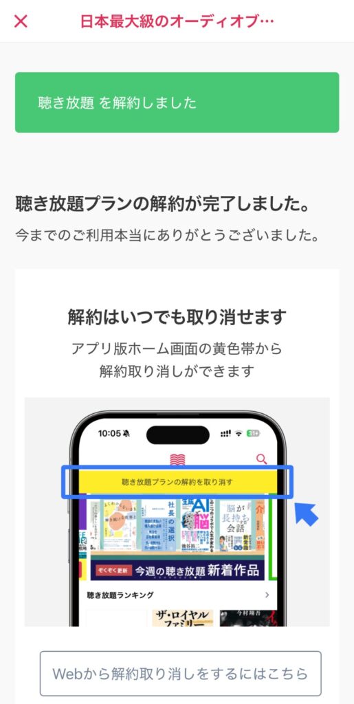 完了画面で「聴き放題を解約しました」「解約が完了しました」と表示されれば、手続きは完了です。